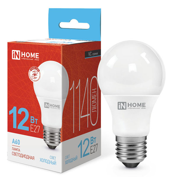 Лампа светодиодная "IN HOME" LED-А60-VC 12Вт Е27 6500К (дневной синий свет) 1 шт.(10)