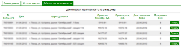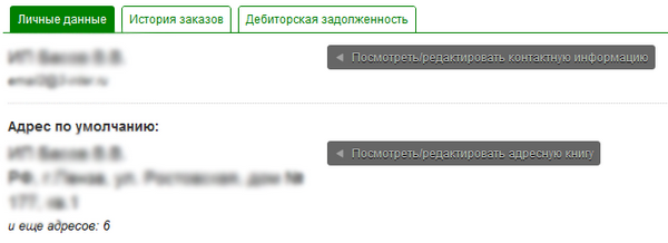 Личные данные – информация о компании (Название организации, Адреса доставки, Контактное лицо, Телефон, Факс, Email), реквизиты (ИНН, КПП, № л/счета, Банк плательщика, № счета банка, БИК банка), логин и пароль для входа в «Личный кабинет».