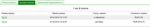 История заказов – заказы через сервис компании с возможностью просматривать статус текущего заказа.